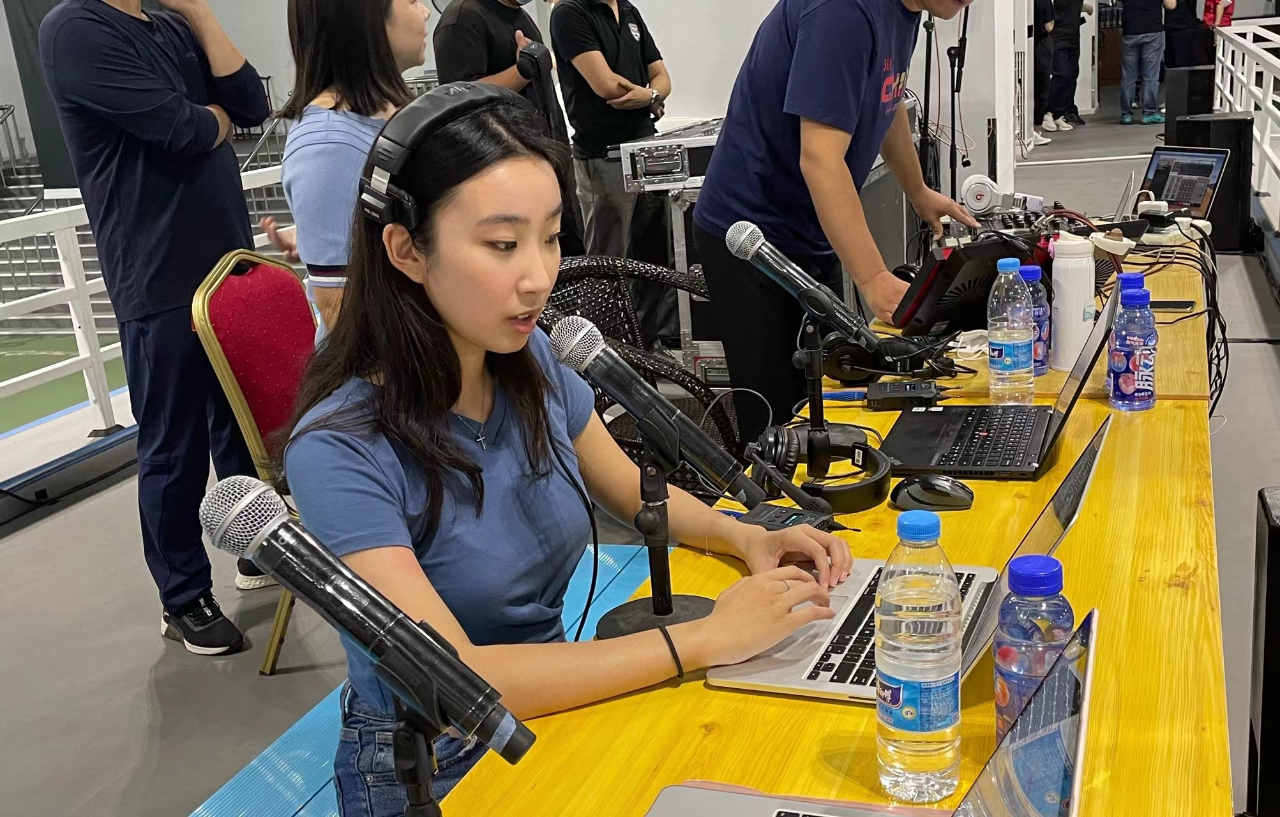 赵一鸣,加拿大籍华裔,中国传媒大学播音主持艺术学院2020级研究生。入选2022年北京冬奥会现场主持,主要负责云顶滑雪公园C区空中技巧、雪上技巧的现场主持。图为2021年8月,赵一鸣在做赛事播报训练。